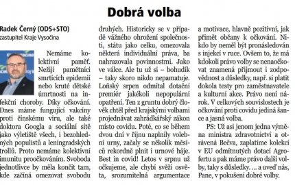 Loňský srpen odmítal dotační premiér jakékoli nepopulární opatření. Ten z gruntu dobrý člověk chtěl před krajskými volbami projednávat zahrádkářský zákon, místo covidu. Po té co se během dvou dní v říjnu naplnili volební urny, začali se několik měsíců rekordně plnit i urnové háje. Best in covid! Letos v srpnu už očkujeme, ale chybí svěží osvěta, srozumitelná argumentace a motivace, hlavně pozitivní, jak přimět občany k očkování. Nikdo by neměl být pronásledován s injekcí v ruce. Ovšem, to že má kdokoli právo volby se nenaočkovat znamená, přijmout i zodpovědnost a důsledky, např. si platit dokola testy pro zaměstnavatele a kulturní akce. Právo není nárok. V celkových souvislostech je očkování proti covidu jediná šance a jasná volba.