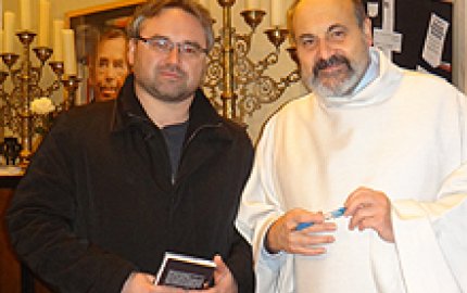 Samozřejmě jsem nemohl po skončení bohoslužby jen tak odejít. Chtěl jsem se s panem profesorem osobně setkat a jak jsem posléze zjistil, nebyl jsem zdaleka sám. V nádherné zákristii, rozlohou asi jako vesnický kostelík, ano i s oltářem, a nádherným barokním nábytkem, se zdravil s mnoha lidmi přátelsky s nimi diskutoval. Vydržel bych tam dlouho. Samozřejmě nebyl prostor k delším disputacím, a nepřipadalo mi vhodné ho zdržovat, ale pár slov, podání ruky, podepsání knihy a společná fotka vzbudila ve mne pocit obdarovaného.